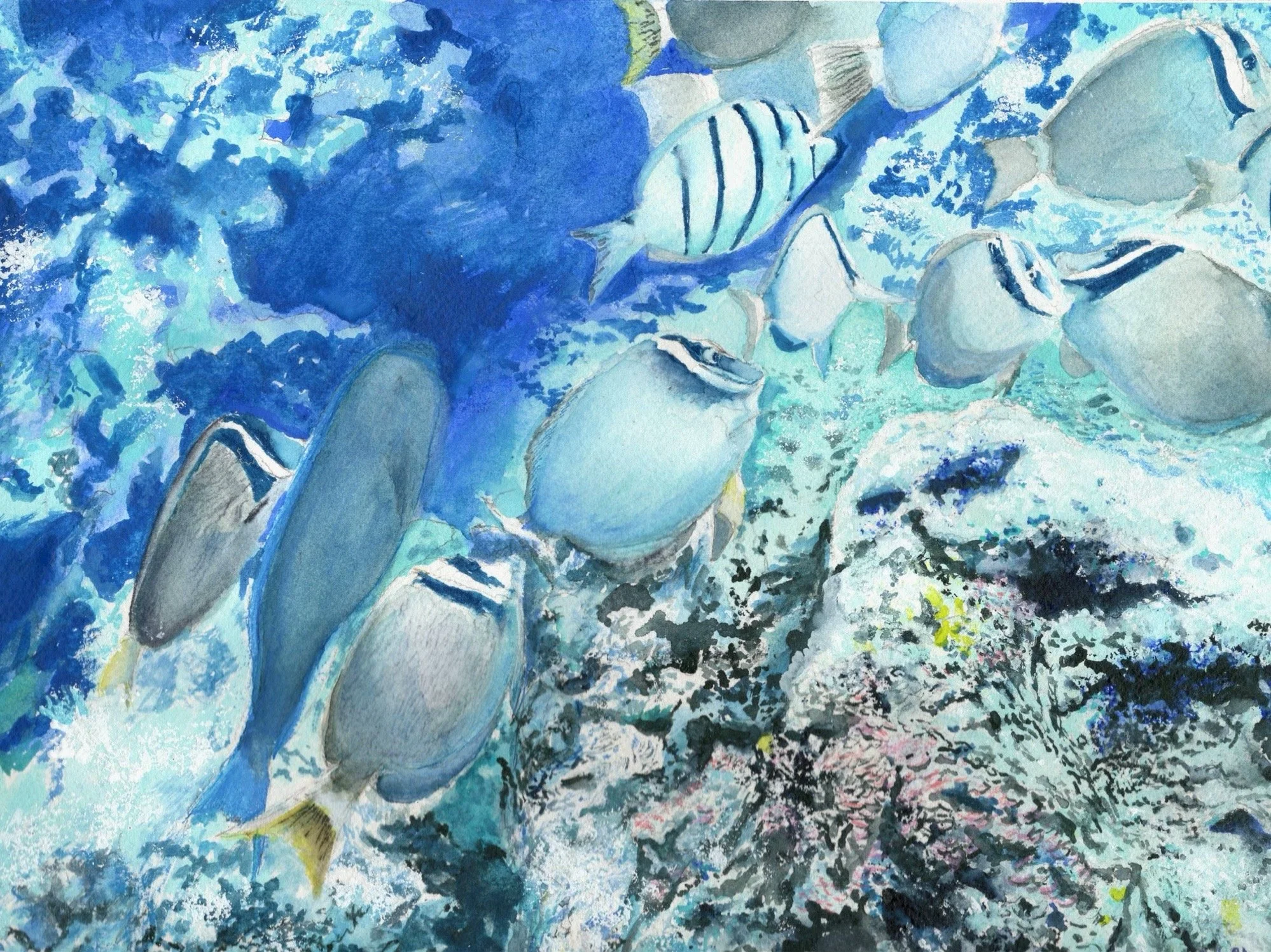 “A coral ballet in motion-underwater rhythm and reef life in watercolor”